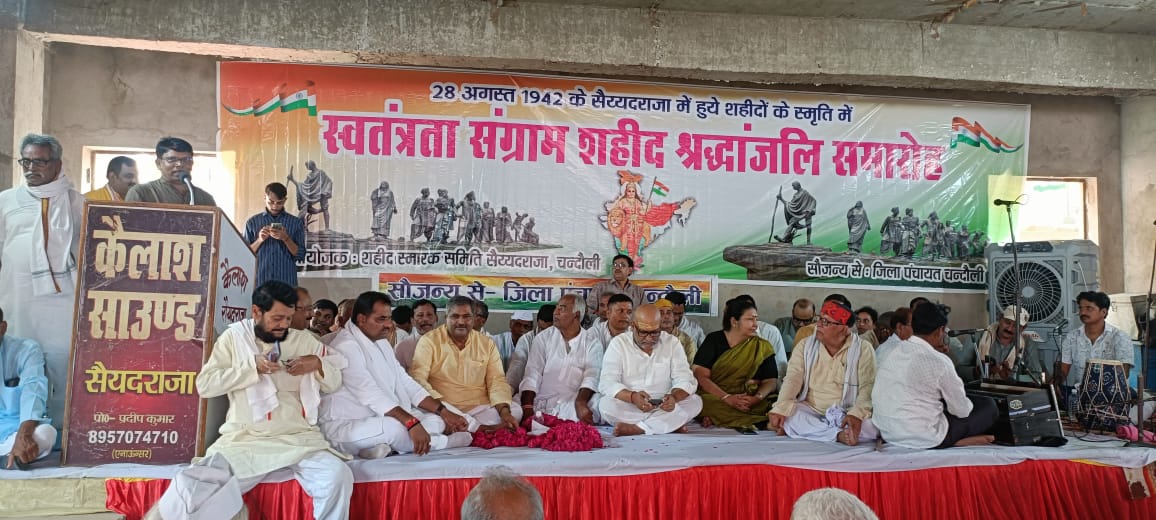 सैयदराजा (चंदौली) नगर पंचायत स्थित शहीद स्मारक प्रांगण में 28 अगस्त को शहीद दिवस पर श्रद्धांजलि समारोह भव्य रूप से मनायी गयी। गुरूवार को आयोजित समारोह में स्वाधीनता संग्राम सेनानियों को सर्वप्रथम श्रद्धांसुमन अर्पित करते हुए कार्यक्रम के मुख्य अतिथि सैयदराजा विधायक सुशील सिंह तथा विशिष्ट अतिथि विधान परिषद सदस्य धर्मेंद्र सिंह उपस्थित रहें। समारोह में सांस्कृतिक कार्यक्रमों कार्यक्रमों से शुरू हुई । जिसमें प्रबुद्धजनों ने स्वतंत्रता सेनानियों के परिजनों को सम्मानित किया गया।